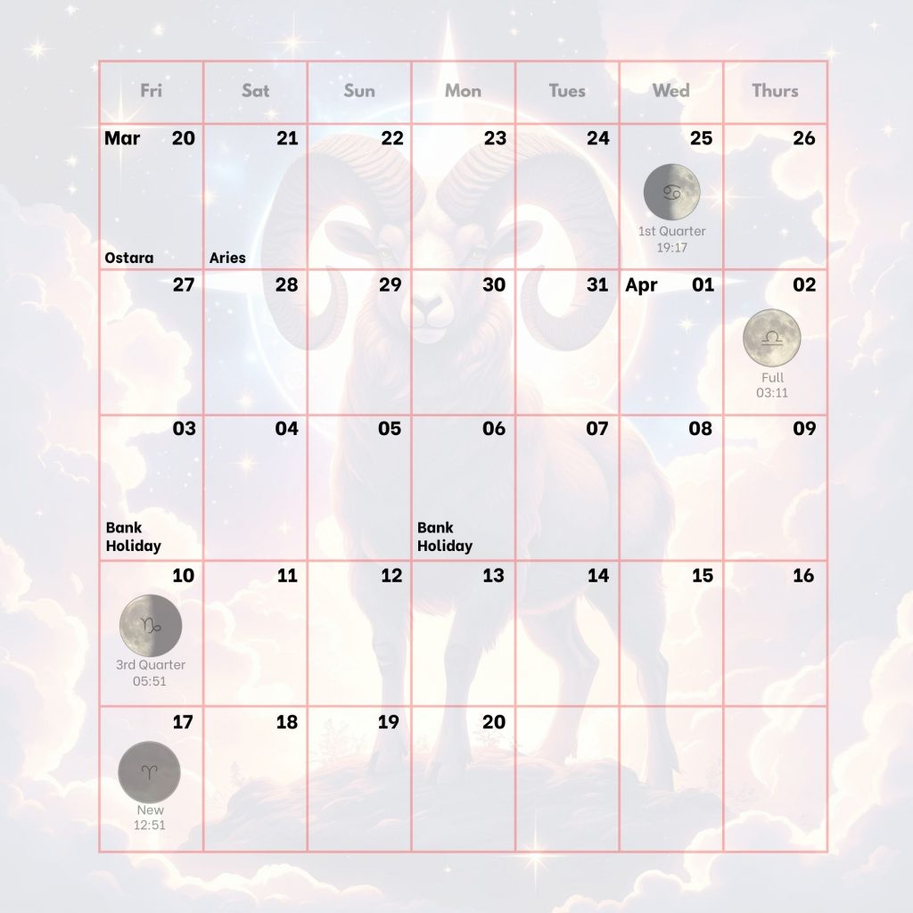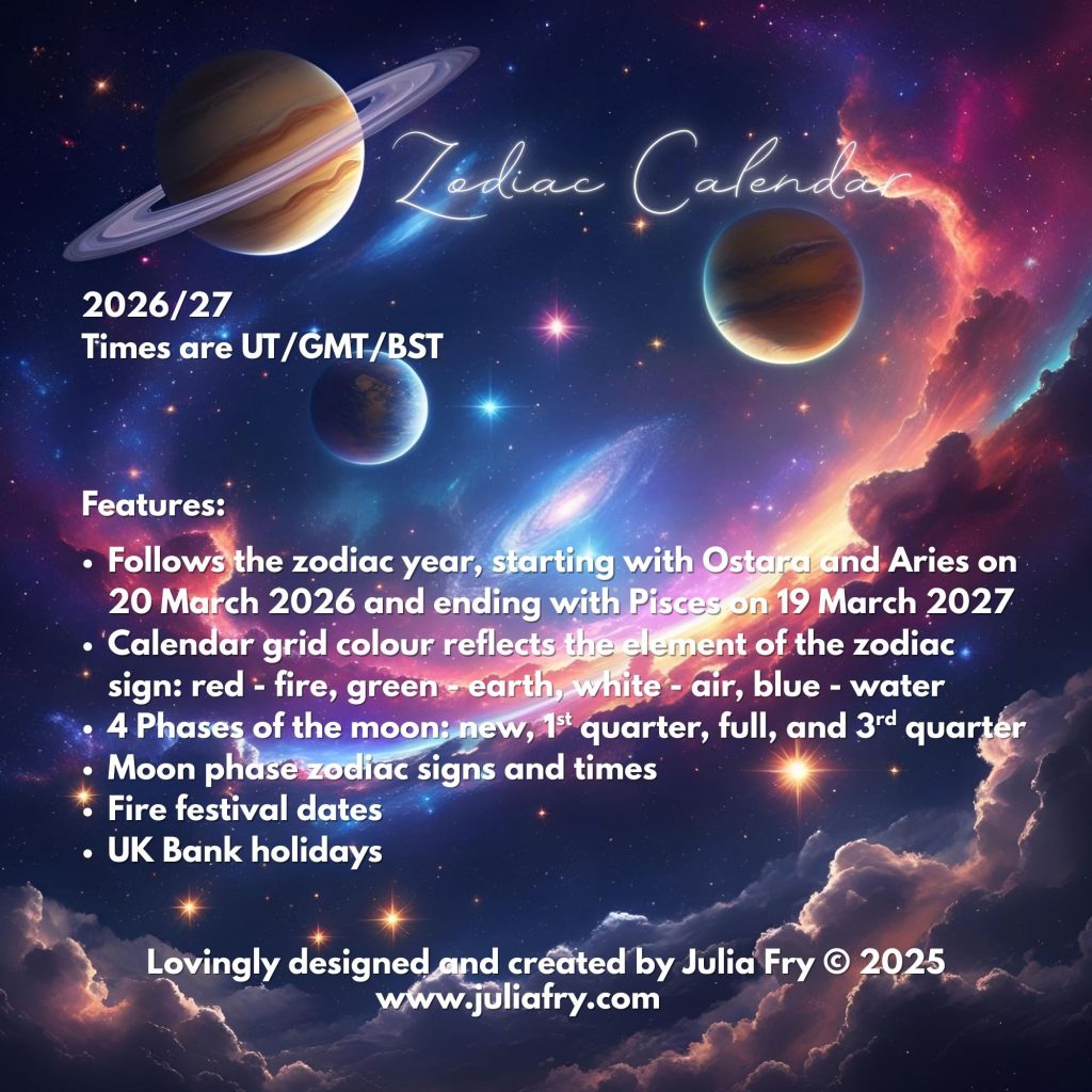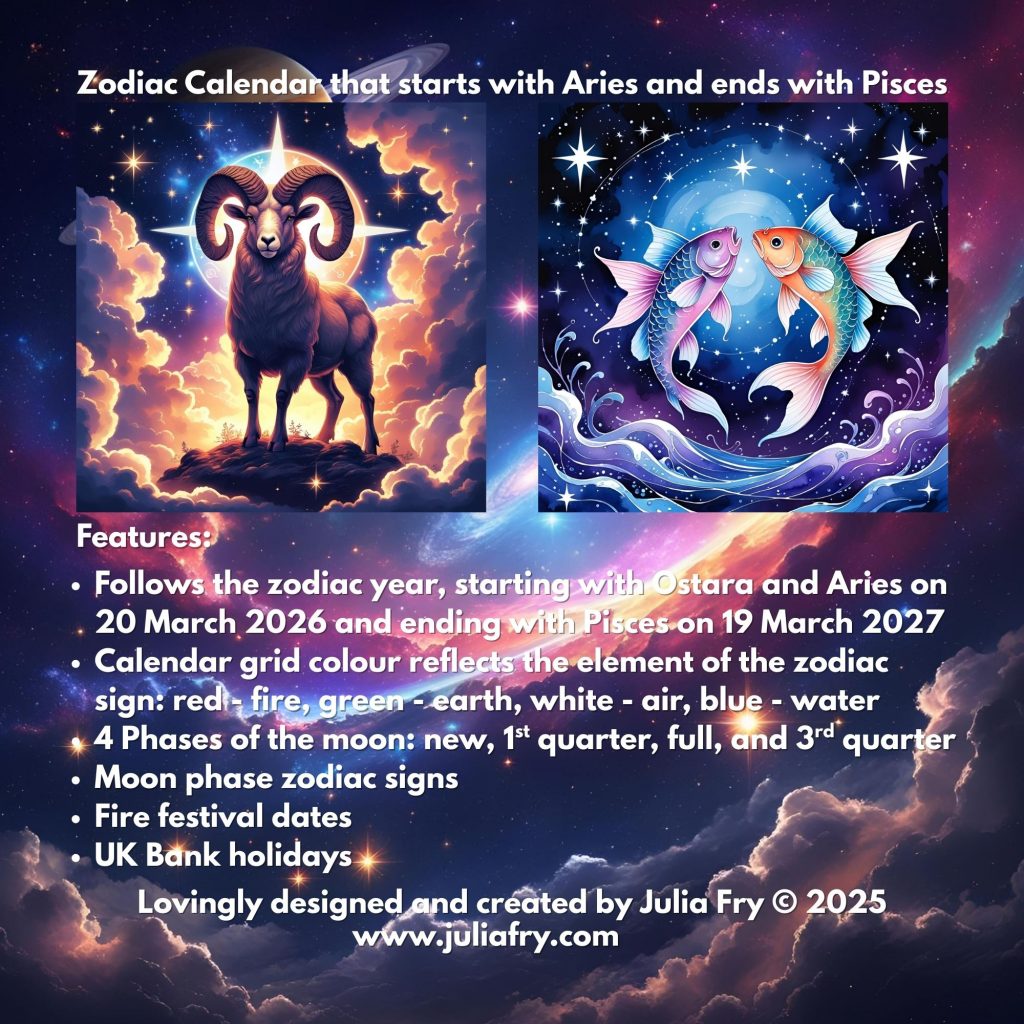 - Follows the zodiac year: March 20, 2026 (Ostara & Aries) – March 19, 2027 (Pisces)